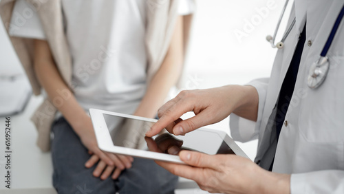 Doctor and child patient. The doctor is using tablet computer and is ready to examine the boy. The concept of ideal health in medicine
