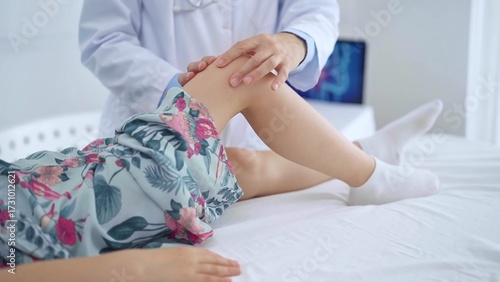 Doctor and kid patient. Orthopedist examining girl's knee in medical clinic. Medicine and health care