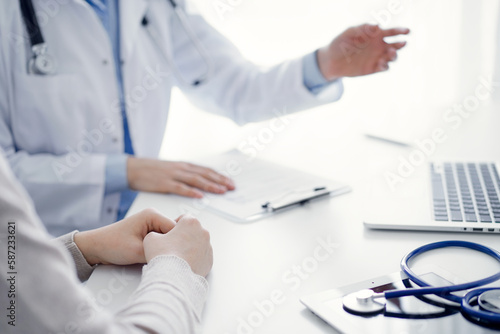 Doctor and patient discussing current health questions while sitting at the table in clinic office, only hands closeup. Medicine concept