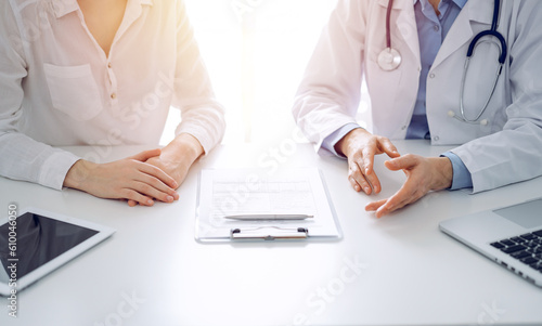 Doctor and patient discussing current health questions while sitting near of each other and using clipboard at the table in clinic, just hands closeup. Medicine concept.