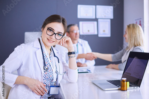 Doctor and patient discussing something while sitting at the table . Medicine and health care concept