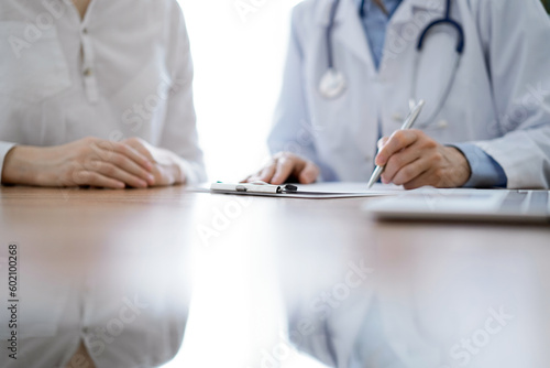 Doctor and patient discussing something while sitting near each other at the wooden desk in clinic, view from above. Medicine concept