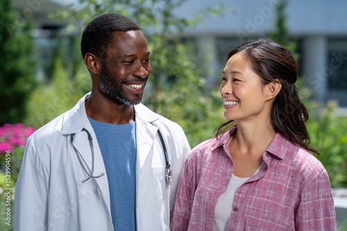 Doctor and Patient Enjoying a Warm Moment in a Garden Setting