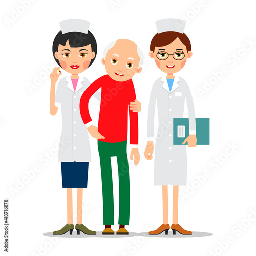 Doctor and patient. Practitioner therapist woman stands and supports old man patient. Hand of medic on shoulder of elderly patient. Physician is holding pill. Consultation and diagnosis. Flat style