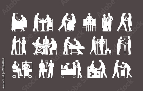 Doctor and patient silhouettes set, medical consultation, healthcare treatment, hospital visit, nurse care, checkup, diagnosis, health professional vector pack