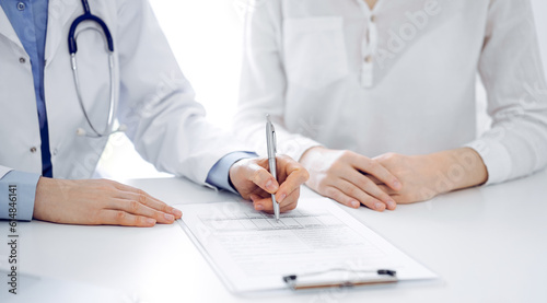 Doctor and patient sitting near of each other at the desk in clinic. The focus is on female physician's hands filling up the medication history record form or checklist, close up. Medicine concept