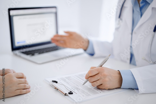 Doctor and patient sitting opposite each other at the desk in clinic. The focus is on female physician's hands filling up the medication history record form or checklist, close up. Medicine concept