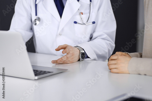 Doctor and patient woman discussing something while sitting in clinic and using laptop. Best medical service in hospital, medicine, pandemic stop