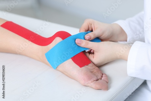 Doctor applying kinesio tapes to patient's foot in hospital, closeup