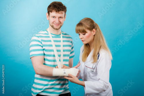 Doctor bandaging sprained wrist.