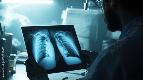 Doctor carefully examines X-ray film of patient's lungs, identifying COVID-19 complications, with medical instruments and charts in the background.