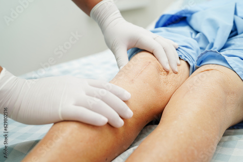 Doctor checking Asian elderly woman patient with scar knee replacement surgery in hospital.