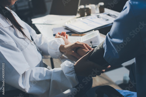 Doctor checking patient arterial blood pressure in hospital. Health care Concept