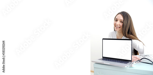 doctor clinic Isolated young business woman presenting laptop. High quality photo