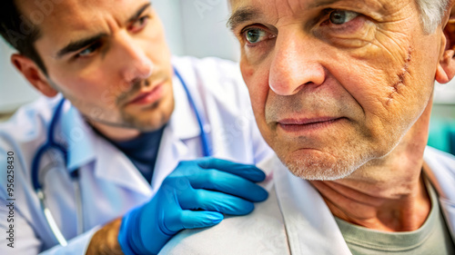 Doctor Comforting A Patient With A Hand On His Shoulder. Compassionate Healthcare.