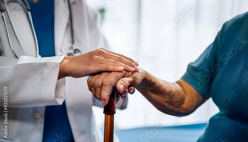 Doctor in a white coat gently holding the hand of an elderly woman resting on a walking cane. Senior healthcare, compassion, medical support, patient care, and nursing concept.