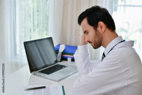 Doctor Concept. Doctors are making serious faces. The doctor is stressed about work. The doctor is feeling a headache at work. The doctor is feeling stressed in treating the patient.