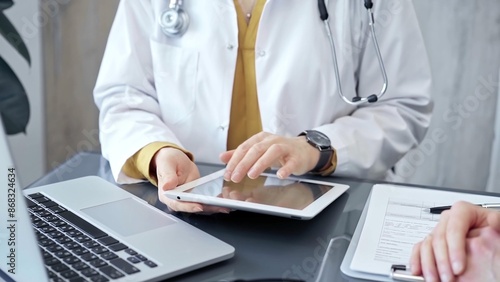 Doctor consulting patient with tablet and laptop. Healthcare professional discussing treatment options using digital devices. Medicine and health care concept
