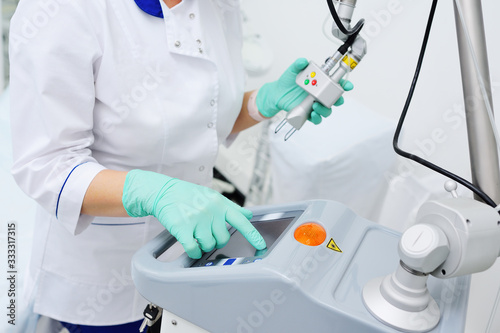 doctor cosmetologist dermatologist holds an innovative device for skin rejuvenation, removal of scars, scars and pigmentation-fractional laser.
