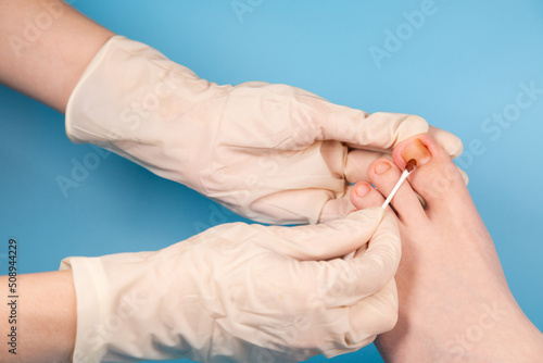 doctor disinfect the injured toenail. Hands in rubber gloves touch injured toenail in clinic. Diagnosis, treatment of mycosis of feet. Podiatrist treating ingrown toenail. Inflammation of the toes
