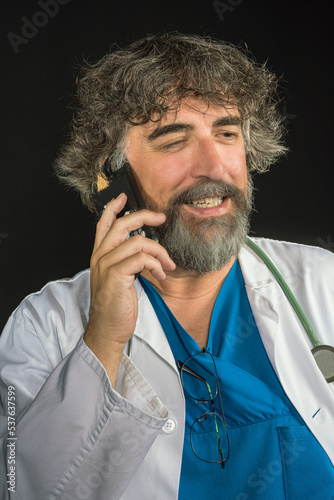 doctor dressed in the blue surgical suit and white coat consulting a mobile phone