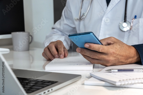 Doctor engaging with a smartphone in a modern medical setting, seamlessly integrating digital tools into patient care