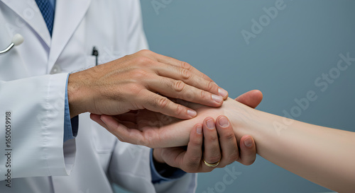 Doctor examining patient's wrist for medical diagnosis or injury assessment