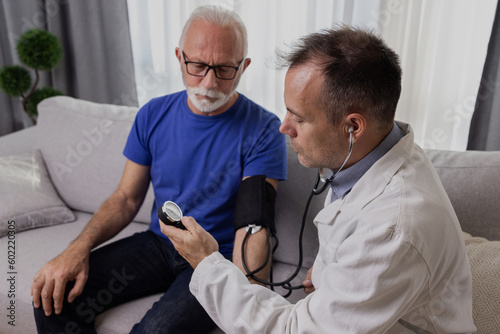 Doctor examining senior male patient by measuring blood pressure at home. Elderly people medicare, healthcare, hypertension concept