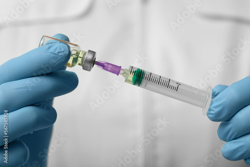 Doctor filling syringe with hepatitis vaccine from glass vial, closeup