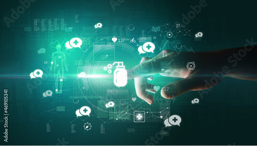 Doctor hand pressing futuristic health device with medical symbol on screen