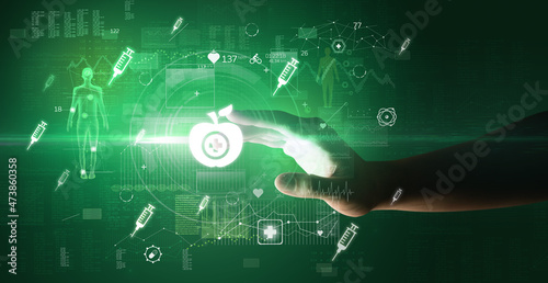 Doctor hand pressing futuristic health device with medical symbol on screen