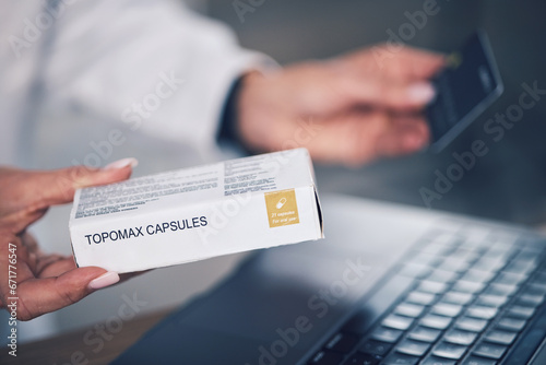 Doctor, hands and box with credit card for payment, medication or tablets at pharmacy or hospital. Closeup of woman, pharmacist or medical expert with pills, debit and pharmaceuticals for transaction
