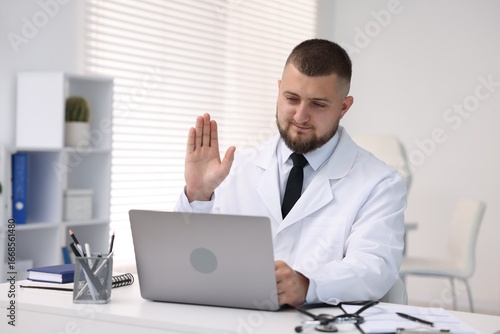 Doctor having online consultation via laptop in clinic