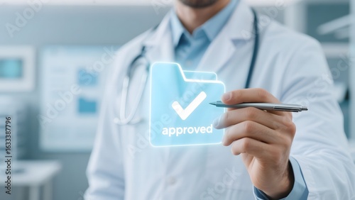 Doctor holding a pen, interacting with a holographic 'approved' folder in a medical setting