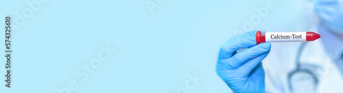 Doctor holding a test blood sample tube with calcium test.Banner.Copy space for text