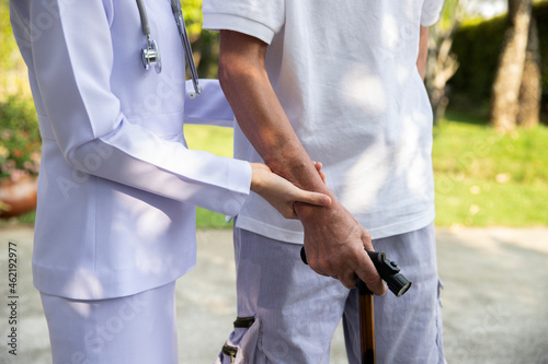 Doctor holding elderly patient's hands with walking stick