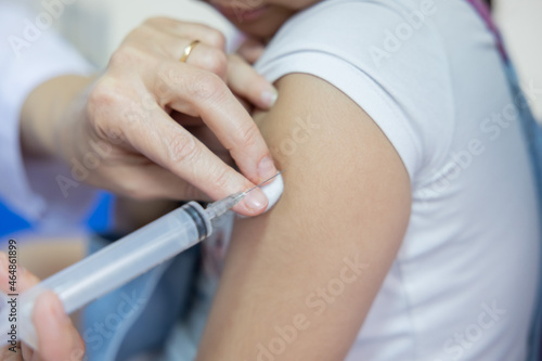 Doctor Holding Syringe Injecting the Vaccine into Patient Shoulder