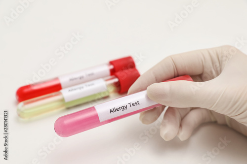 Doctor holding tube with label ALLERGY TEST on light background, closeup