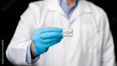 Doctor holds COVID 19 Coronavirus vaccine in his hand, infected blood sample in the sample tube, Vaccine and syringe injection It use for prevention, immunization and treatment from COVID-19
