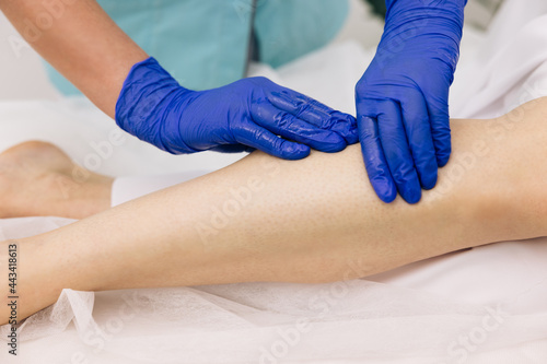 Doctor in gloves examining painful knee of female patient leg trauma. Healthcare medical insurance concept. Physiotherapist worker woman assisting physical medical exercise recovery after injuries