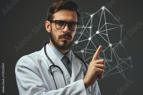 Doctor in lab coat with stethoscope pointing at a digital network structure on a dark background.