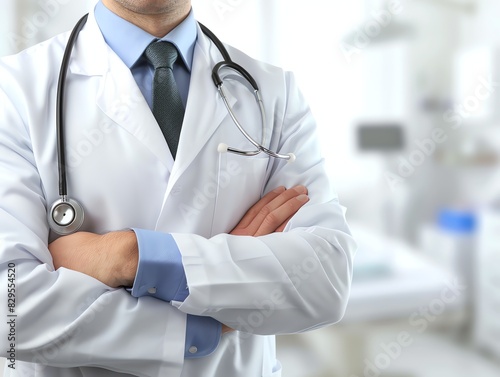 Doctor in uniform holding stethoscope and crossed arms. Hospital or clinic background and copy space