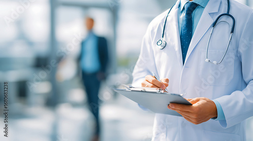 Doctor in white coat with stethoscope writing on clipboard in hospital hallway