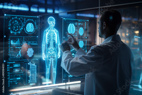 doctor looking at x ray image of human brain and body at virtual screen to show digitalization in medicine in hospitals