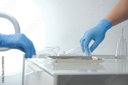 doctor nurse at same time put plastic transparent glasses on glass table with instruments for operations stomatology hospital hospital blue gloves sterile protective glasses close-up modern clinic