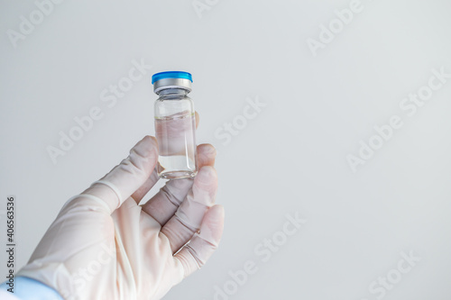 Doctor or scientist holding ampoule liquid vaccines with medication in the laboratory. Vaccination and immunization. Close up.
