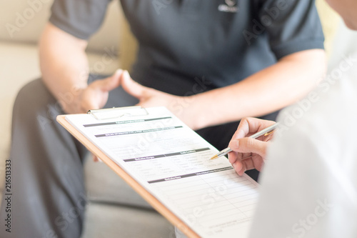 Doctor physician consulting with male patients in hospital psychology clinic exam room. Men's health and psychotherapy concept..
