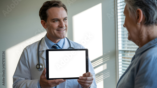 Doctor presenting tablet to senior patient in office with stethoscope and white coat smiling