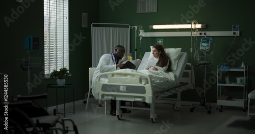 Doctor presents the tablet for the patient to sign, then stands up and walks away.