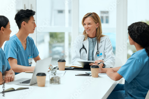 Doctor, review and medical students with technology as group for healthcare, discussion or feedback. People, talking and diversity in meeting in teamwork as staff for internship in clinic or hospital